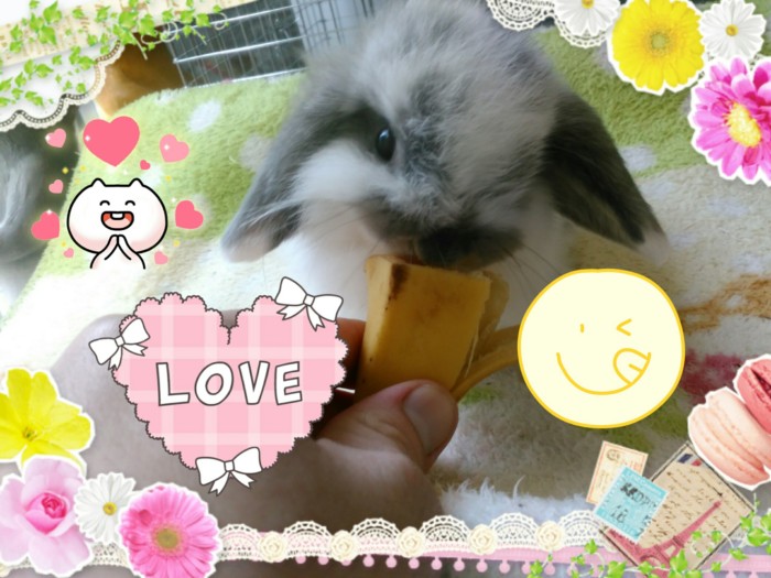 ご予約頂いてるホーランドロップ(ブロークンブルー)モーリスの赤ちゃんです。体重の上がりが遅いので、スーパーフードで調整してるんです。ただのバナナですが、あることして何度なく復活してる自己流の裏技なんです。自分から、ガツガツ食べるから、毎日コツコツやるしかいないな~です。Kさん、今しばらくお待ちくださいね。