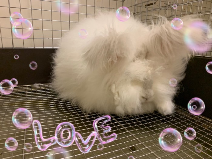 休み中の!イングリッシュアンゴラ(フロスティー)のシトロンです。ふあふあに保ってましたが、少し気抜いたらこうなってしまいました。今トリマー学校通ってるお客さんが居て、いつかバイトしてくれるといいなで、お母さんが「修行させてやってください。」と言ってくれてますが、バイトさんとして働いて色々覚えてくれるてもいいなですが・・・免許の学校も行って、バイトもしてるから、色々落ち着いてからかなです。