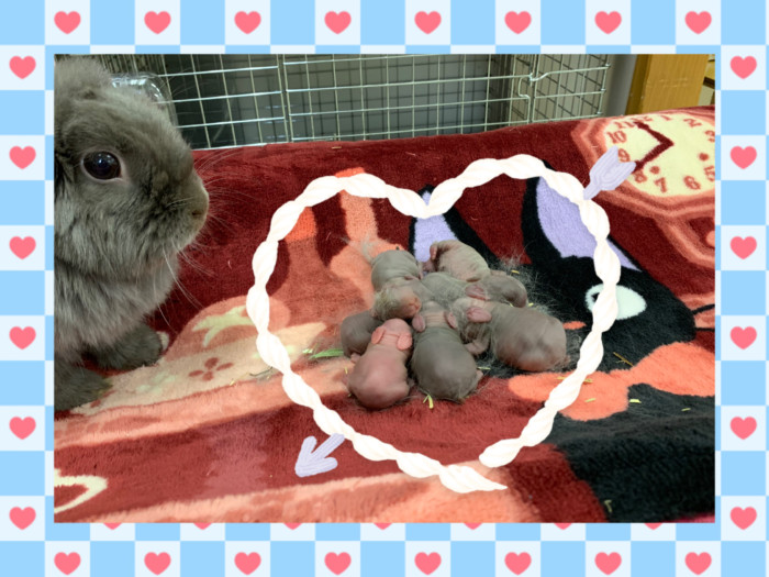 ホーランドロップ(ライラック)のジュリーが!7羽出産してくれましたが、大きさにバラつきあるので、2羽は、どうかな?です。多分オター系出てますので、何羽か残すと思います。成長をお楽しみ。