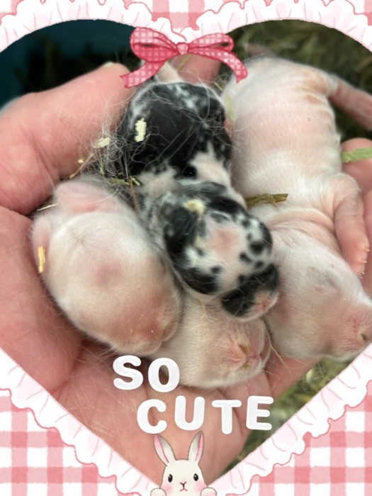 1月11日生まれ!ホーランドロップ(ブルーアイドホワイト)ハッピーの赤ちゃん達です。白く見えるのは、ブルーアイ3羽でいいと思います。(違ったら訂正します。笑)ブチの!ブロークンチェスナット微妙です。