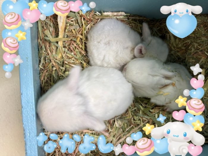 1月11日生まれ!ホーランドロップ(ブルーアイドホワイト)ハッピーの赤ちゃん達です。メス1羽と!オス1羽の問い合わせ頂きどうするかは?成長次第ですが・・・シナモロールマニアの知り合いも「欲しい。」って言ってくれていて部屋が水色ベースで、シナモロールグッズしかなかったんです。(見た目も・性格もキツイのに(笑)意外だったな~です。笑)